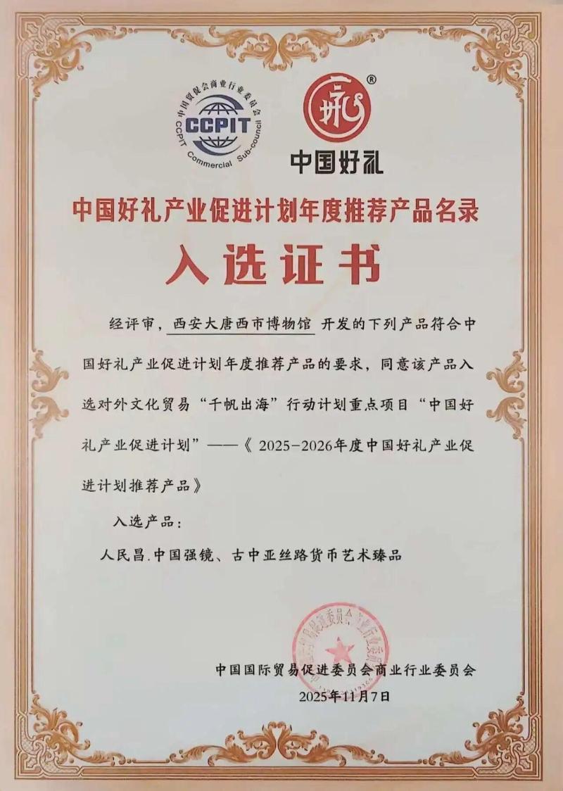 大唐西市博物馆精心研发的“人民昌·中国强镜”与“古中亚丝路货币艺术臻品”两款文创产品,凭借其深厚的文化底蕴与创新的设计理念,从全国超5000款参赛产品中脱颖而出,成功入选“中国好礼产业促进计划2025-2026年度推荐产品”终评会国家级推荐名录。