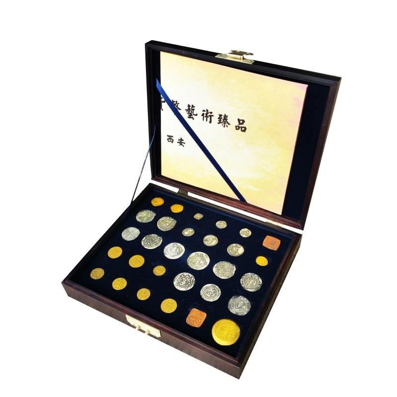 “古中亚丝路货币艺术臻品套盒”则通过再现丝路古国货币,勾勒出一幅公元前3世纪至公元19世纪的货币文化长卷。这些形态各异、铭刻着不同文字与王权印记的钱币,曾是2023年中国-中亚峰会定制的国礼。产品以合金压铸工艺还原历史质感,配以紫檀木盒与多语种说明,在方寸之间再现了盛唐时期丝绸之路“商旅相继,纵横交错”的繁华景象,彰显了长安作为世界文明交流枢纽的永恒魅力。