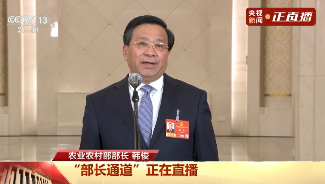 3月9日上午,十四届全国人大四次会议第二场“部长通道”集中采访活动在人民大会堂北大厅举行,农业农村部部长韩俊接受记者采访。